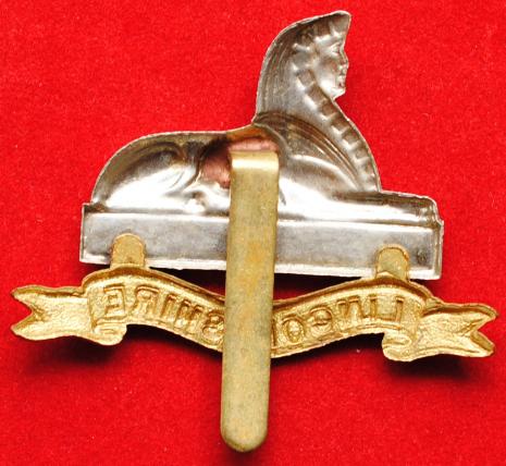 The Lincolnshire Regiment Cap Badge 4th/5th Battalion Territorial Force 1901 - 1919 in white metal with brass slider these battalions had the regular pattern bimetal badge but differed in having a blank Egypt plinth below the Sphinx